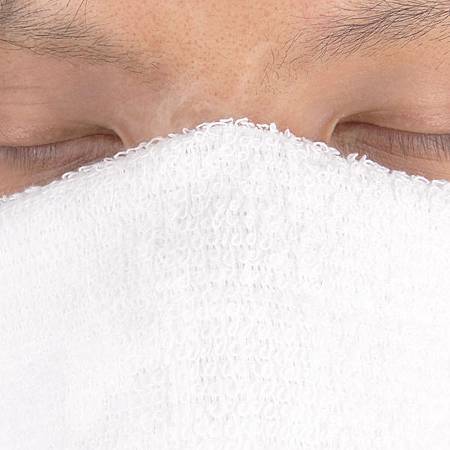 將臉部水分擦乾,使用前先用熱毛巾蒸臉,打開毛孔;
